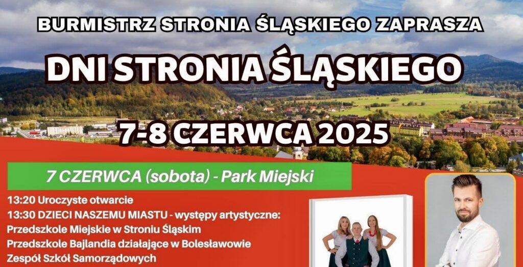 Serdecznie zapraszamy na tegoroczne Dni Stronia Śląskiego, które odbędą się w dniach 7–8 czerwca 2025 roku w Parku Miejskim, tuż przy Urzędzie Miejskim. Przed nami wyjątkowy weekend pełen atrakcji, muzyki i i dobrej zabawy.