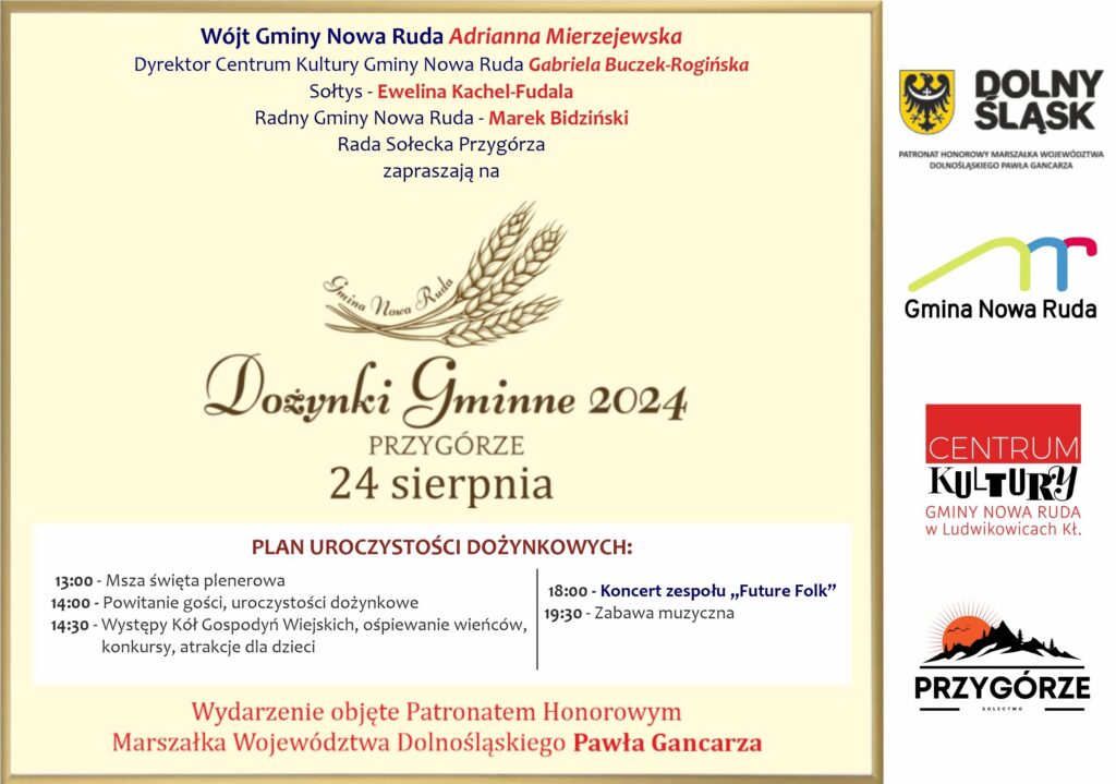 Wójt Gminy Nowa Ruda Adrianna Mierzejewska serdecznie zaprasza na Dożynki Gminne w Przygórzu, które rozpoczną się o godz. 13.00 Mszą Świętą plenerową na boisku.