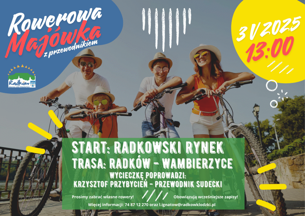 3 maja zapraszamy na wycieczkę rowerową z przewodnikiem! Start o godzinie 13:00 z radkowskiego Rynku, kończymy na Strażackiej Majówce w Wambierzycach!