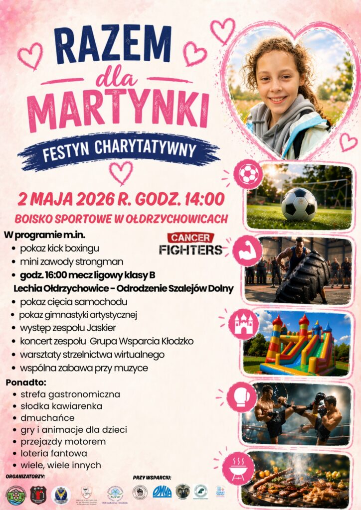 Już 2 maja w Ołdrzychowicach Kłodzkich odbędzie się wyjątkowe wydarzenie charytatywne, które połączy dobrą zabawę z realną pomocą. Na boisku sportowym od godz. 14:00 mieszkańcy gminy oraz goście spotkają się, by wspólnie wesprzeć 10-letnią Martynkę, walczącą z ciężką chorobą nowotworową.