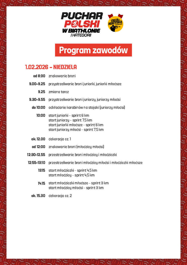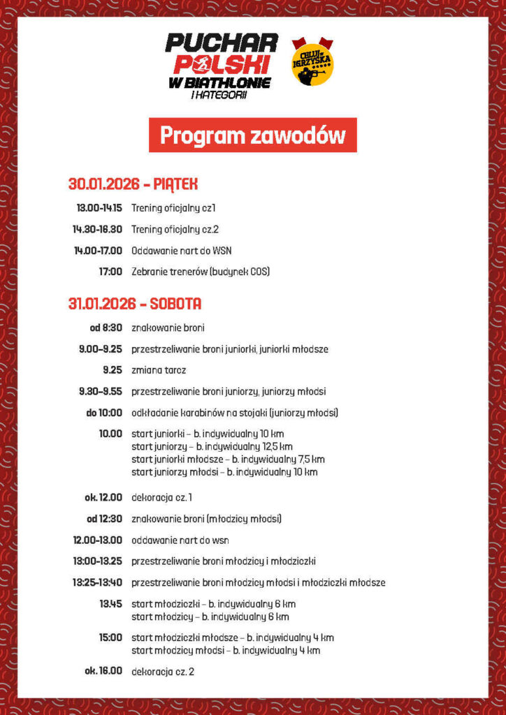 W dniach 30.01. – 1.02 na terenie COS OPO w Dusznikach-Zdroju zorganizowany zostanie Puchar Polski „Celuj w Igrzyska”. Poniżej publikujemy program zawodów.