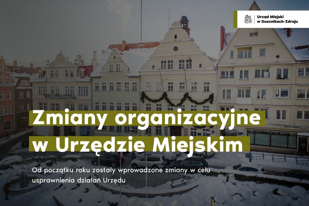 Od 1 stycznia 2025 roku w Urzędzie Miejskim w Dusznikach-Zdroju wprowadzone zostały zmiany organizacyjne. Jak czytamy w komunikacie wydanym przez urząd, ich celem jest stworzenie dobrze zorganizowanego i przyjaznego dla mieszkańców urzędu, który skutecznie realizuje swoje zadania.